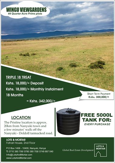 A few steps off the main Nanyuki – Doldol road, lies Wingu View consisting of 44 parcels, each measuring 50 by 100 ft. This lot is centrally placed within Laikipia County and approximately 220 kilometers from Nairobi ,a journey of about 2.5 hours drive. The parcel of land is located in an area known as Kariunga ,north of Nanyuki town in Laikipia County.